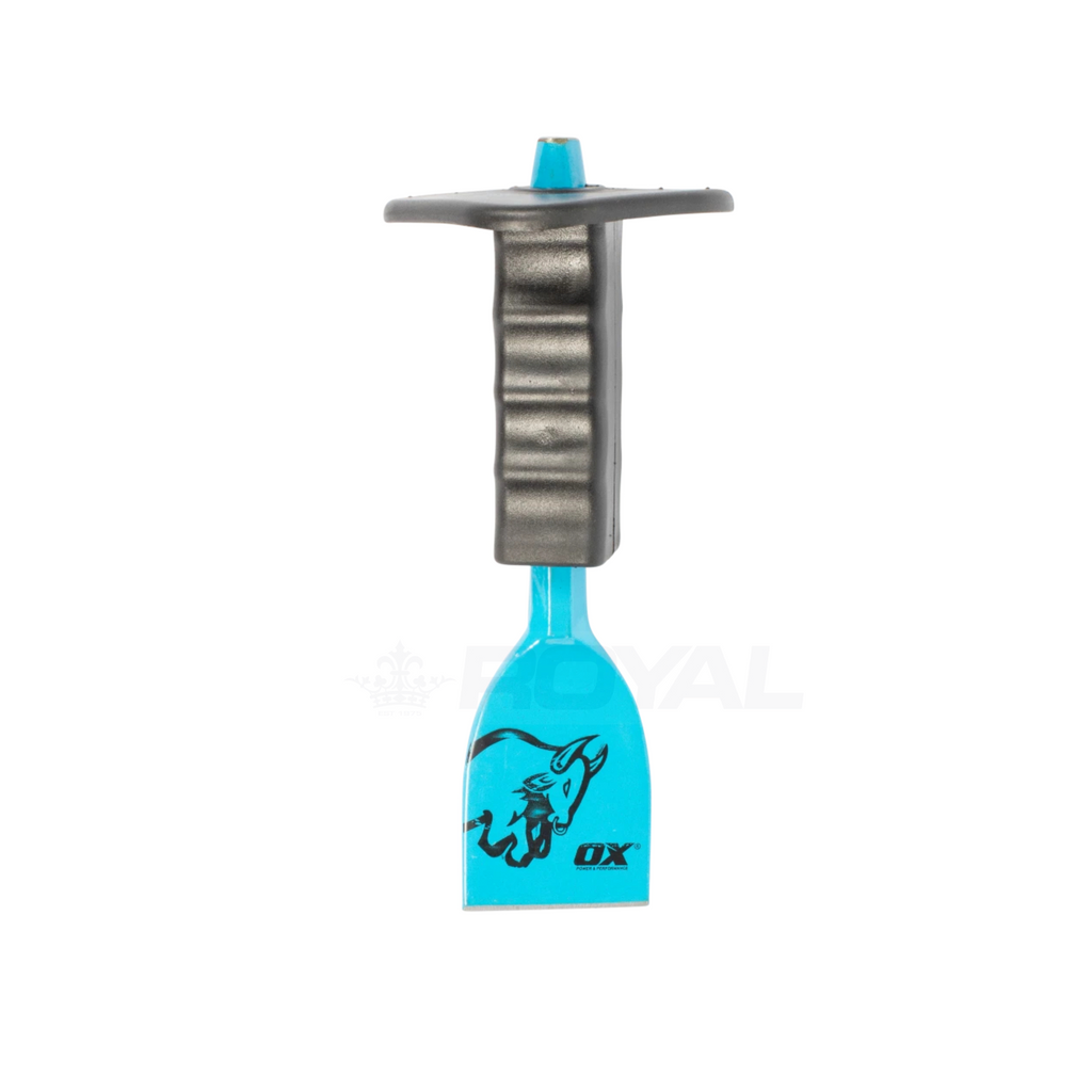 The OX Brick Bolster with Guard – 58mm / 2¼" is a tough, professional-grade tool designed specifically for electricians and tradespeople. Manufactured from drop-forged steel for superior durability, it features a comfortable rubber grip with a protective top guard for added safety during use. With a 58mm wide blade, this bolster is perfect for precise chisel work in brick and masonry, making it an essential tool for demanding jobsite conditions.